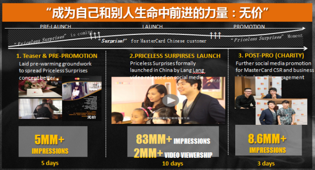 “无价惊喜”这一案例是万事达卡中国区市场营销副总裁刘恬颐分享:邀请明星参加活动、拍摄视频将“无价惊喜”植入到消费者的心中,最后通过公益活动,帮助孩子们完成音乐梦想。那么,怎么样能够在这个全球的离你稍微有一点远的明星,能够拉到跟你更接近的地位?万事达卡挖掘出了8个真实的、与消费者息息相关的故事。